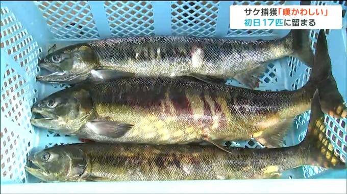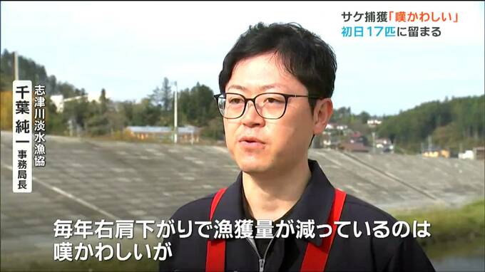 南三陸町志津川の八幡川です。「やな」と呼ばれるしかけの中でサケの姿はまばら。作業員が、1匹ずつ網を使ってすくいあげていきました。初日の捕獲数は、去年より5匹多い17匹でしたが、多い時は1日100匹以上捕獲していたため、数は大きく減っています。