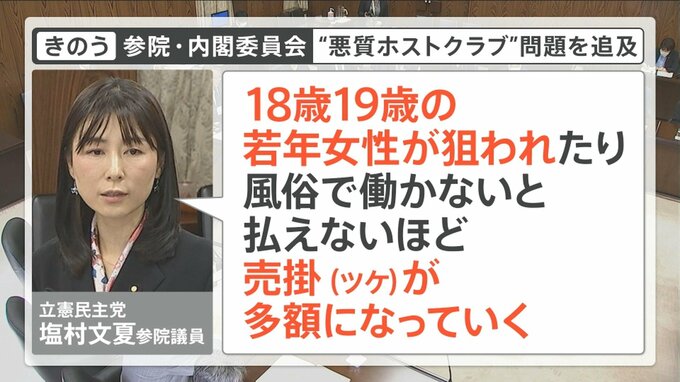 9日も、参議院の内閣委員会で、立憲民主党の塩村文夏議員から「18歳19歳の若年女性が狙われたり、風俗で働かないと払えないほど、売掛(ツケ)が多額になっていく」といった指摘がありました。