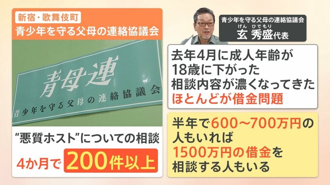 深刻さを増していく、悪質ホストクラブの問題。こちらに取り組んでいる「青少年を守る父母の連絡協議会」(新宿・歌舞伎町)に取材したところ、悪質ホストについての相談は、4か月で200件以上に及ぶということです。