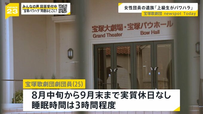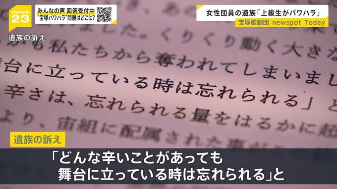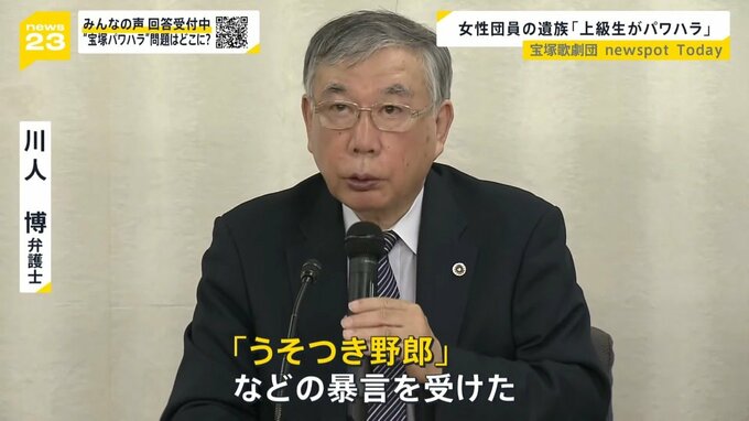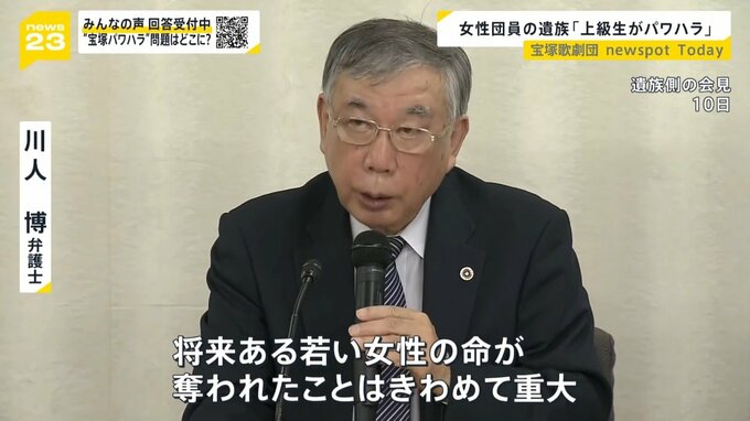 宝塚歌劇団の団員の女性が急死した問題で、遺族側が初めて会見を行いました。遺族側は長時間業務と上級生によるパワハラが原因だと訴え、謝罪を求めました。