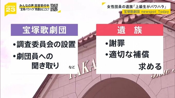 歌劇団は、外部の弁護士を中心とした調査委員会を設け、劇団員への聞き取りなどを行っていますが、遺族は歌劇団側に謝罪と適切な補償を求めています。
