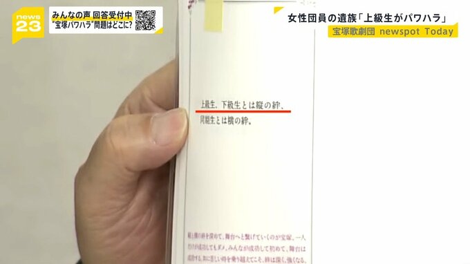 会見中、代理人弁護士が示したのは、劇団員本人が持っていた生徒手帳です。そこに記されている “上級生、下級生とは縦の絆“という部分を紹介しました。