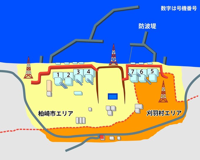 やや長いその名称は「柏崎市」と「刈羽村」にまたがって立地していることが由来している。1~4号機は柏崎市、5~7号機は刈羽村にあり、敷地の7割が柏崎市側だ。