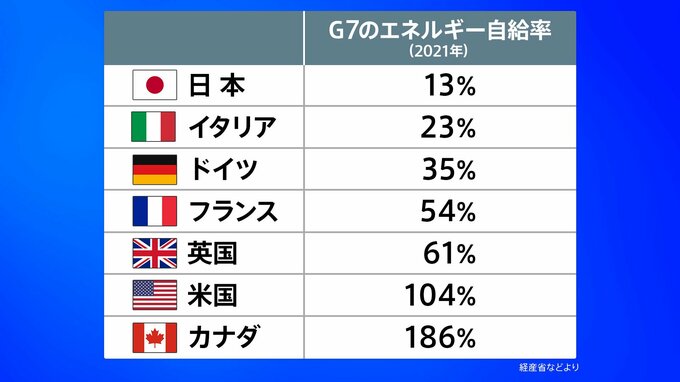 原発再稼働を強力に後押しするのは政府だ。その背景には日本のエネルギー自給率の低さがある。G7のなかで比較しても、13%とダントツで低い。