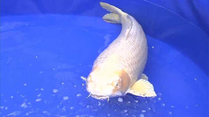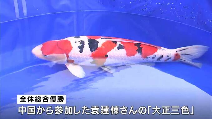 品評会の全体総合優勝を勝ち取ったのは中国から参加した袁建棟さんの「大正三色」です。会場を訪れた人たちはさまざまな賞を受けた鯉たちに見入っていました。