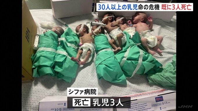 イスラエル軍が攻勢を強めるパレスチナ自治区ガザの北部では病院が機能停止に陥るなど深刻な状態となっています。ガザ最大級の病院では乳児の命も危険にさらされていて、すでに3人が死亡しています。パレスチナ赤…