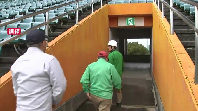 試合中に球場の2階の資材倉庫から出火したという想定で、球場の職員は、消防へ通報するとともに客の避難誘導を行い、消防は、現場の状況の確認と、消火と救助の作業手順を確認しました。
