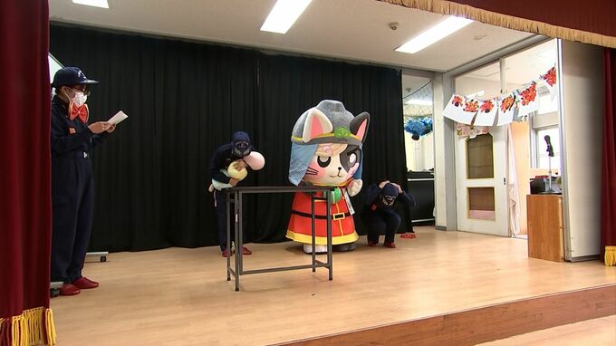 消防団員が寸劇やカードゲームを使って、地震や火事が起きた際に取るべき行動を動物の動きにたとえて学びました。
