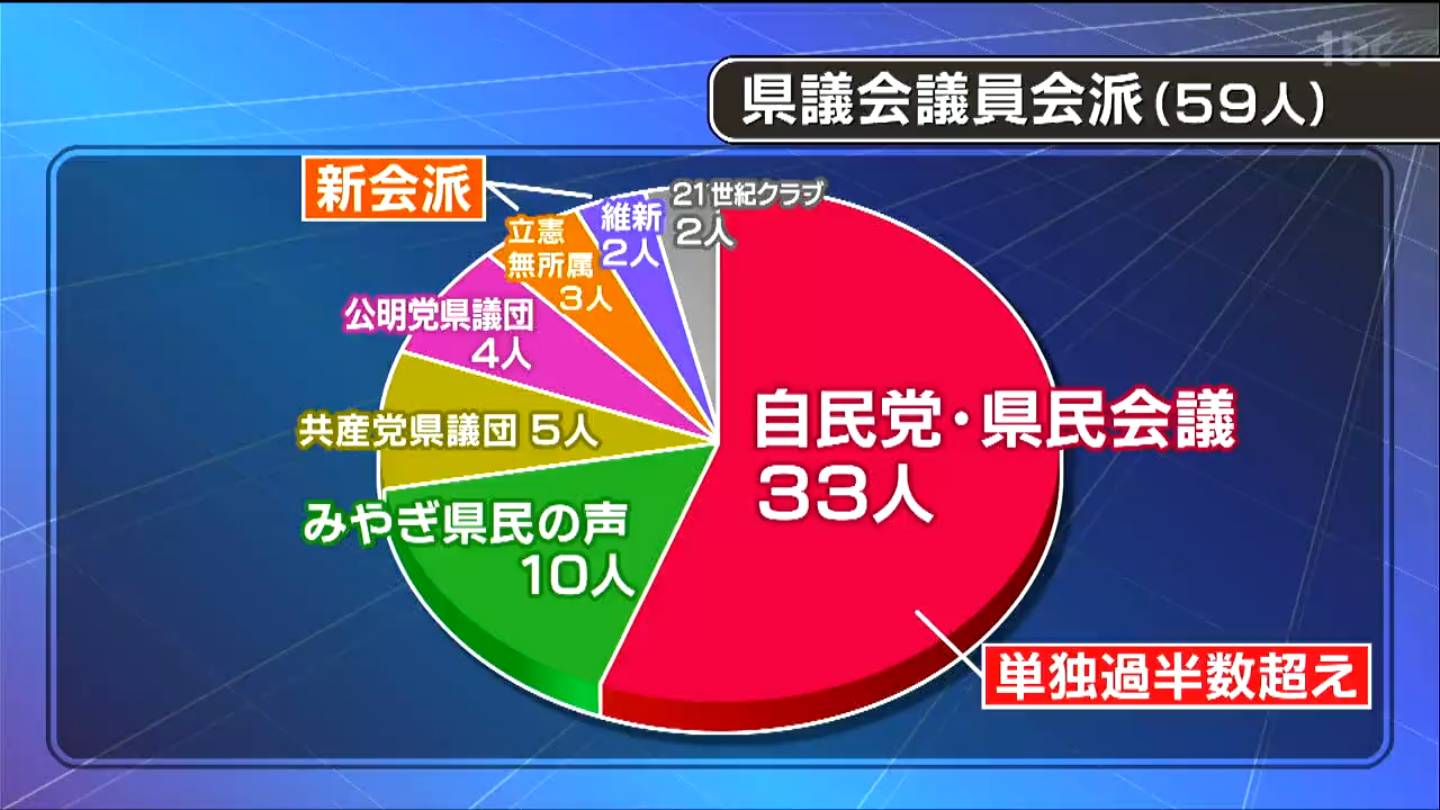 みやぎ県民の声は10人、共産党県議団が5人、公明党県議団は4人、県議会で初の議席を獲得した日本維新の会は2人などとなっています。