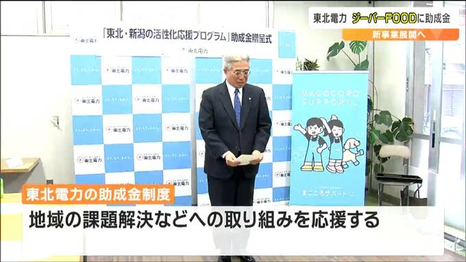 地域のシニア世代の人たちが手作りした弁当を販売する事業、「ジーバーFOOD(フード)」について東北電力は、地域の課題解決などに取り組んでいるとして助成金を贈呈しました。
