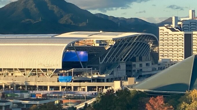 12月には、音響と合わせた映像の動作確認を行う予定です。エディオンピースウイング広島は12月に完成、来年2月に開業予定です。