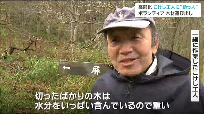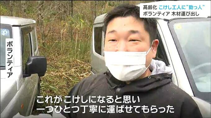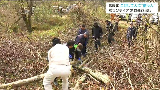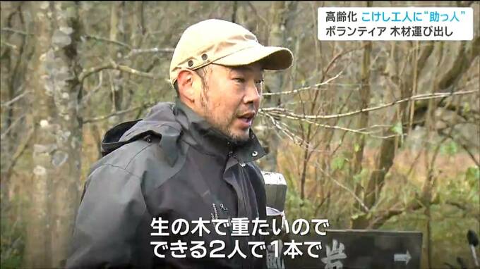 高齢化が進むこけし工人にとって頼もしい助っ人が集まりました。宮城県大崎市鳴子温泉で、ボランティアがこけしの材料となる木材を山林から運び出し、汗を流しました。