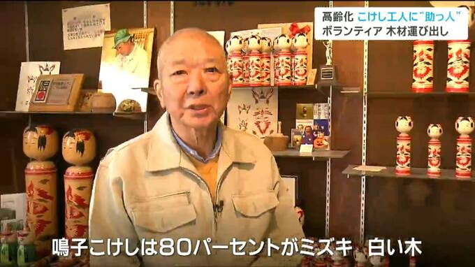 この道50年のこけし工人、岡崎靖男さん69歳。今回、ボランティアを募った組合の代表理事です。こけし工人の高齢化が進む中、木材の継続的な確保が課題だといいます。