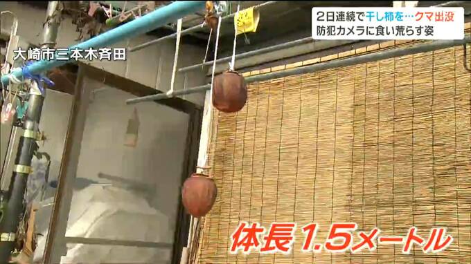 クマが出没したのは、大崎市三本木斉田の住宅敷地内で、体長1.5メートル程のクマ1頭が干し柿を食い荒らしました。こちらの住宅では、12日も午後8時半頃、クマが出没しました。