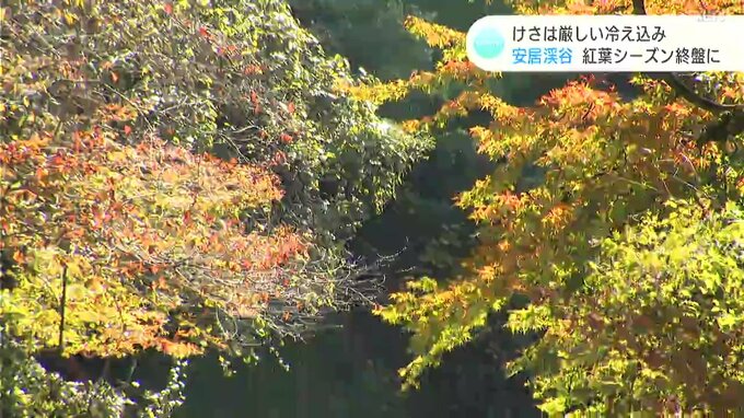 高知県内有数の紅葉スポットとして知られる仁淀川町の安居渓谷では紅葉シーズンの終盤を迎えています。仁淀川町にある安居渓谷です。10月下旬からモミジなどの木々が徐々に色づき始めていましたが、今年は少ない雨…
