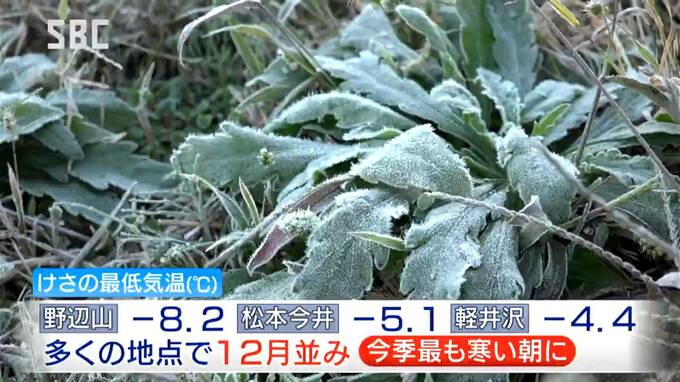 14日朝の最低気温は 野辺山で氷点下8.2度、松本市今井で氷点下5.1度など、多くの地点で12月並みの今シーズンもっとも寒い朝になりました。