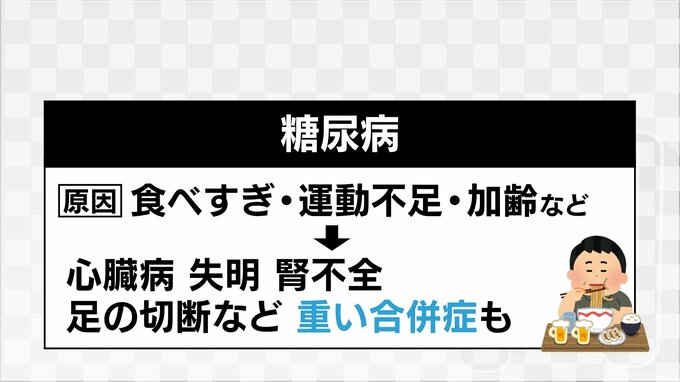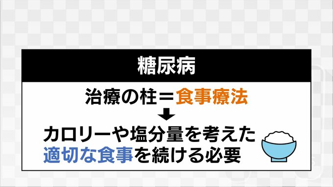 食べすぎや運動不足、加齢などが要因となり、血液中の糖が増えてしまう糖尿病。放っておくと心臓病や、失明、腎不全、足の切断など重い合併症につながります。一度発症すると完治しないといわれていて、治療の柱は「食事療法」。カロリーや塩分量などを考えた適切な食事を続ける必要があります。