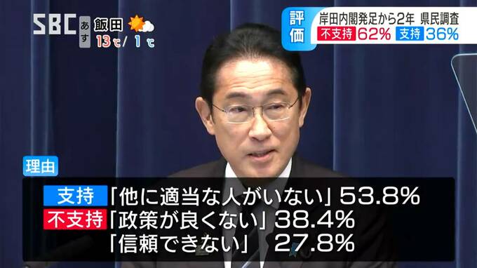 発足から2年が経過した岸田内閣についての長野県民への調査で、「不支持」が62.8パーセントとなり、「支持」の36.2パーセントを大きく上回りました。