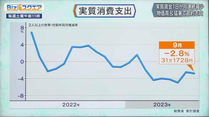 今年9月の家計調査では、2人以上の世帯が消費に使った金額は、去年9月より2.8%減少。7ヶ月連続の減少になった。