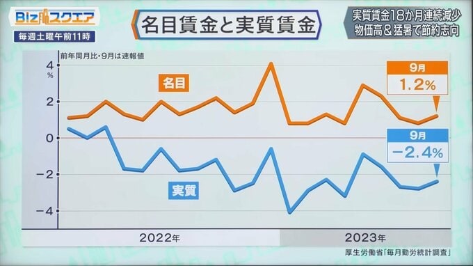 9月の毎月勤労統計によると、物価の変動を反映した働く人1人当たりの実質賃金は、前年同月比2.4%減り、18ヶ月連続の減少となった。