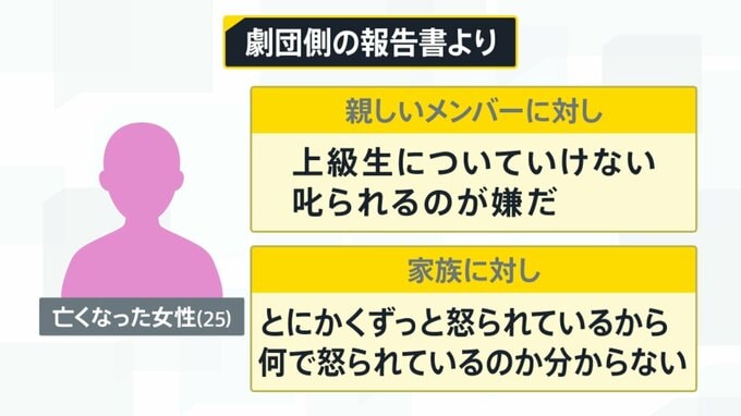 14日の会見でいじめ・パワハラはなかったと言っている一方で、発表された報告書では、ヒアリングの結果、亡くなった女性(25)は、▼親しいメンバーに対し、「上級生についていけない、叱られるのが嫌だ」と述べていた。
