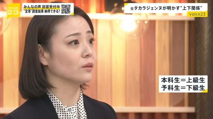 なので、礼儀正しく本科生に接するといった次元の問題ではなくて、ずっと𠮟責、厳しい指導、廊下に呼び出されて怒鳴られるなど、そうした厳しい指導が(宝塚)音楽学校ではずっと続いている。