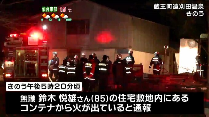 14日夕方、蔵王町の住宅敷地内にあるコンテナを焼く火事があり、この家に住む80代の男性が死亡しました。14日午後5時半頃、蔵王町遠刈田温泉の無職・鈴木悦雄さん(85)の住宅敷地内にあるコンテナから火が出てい…