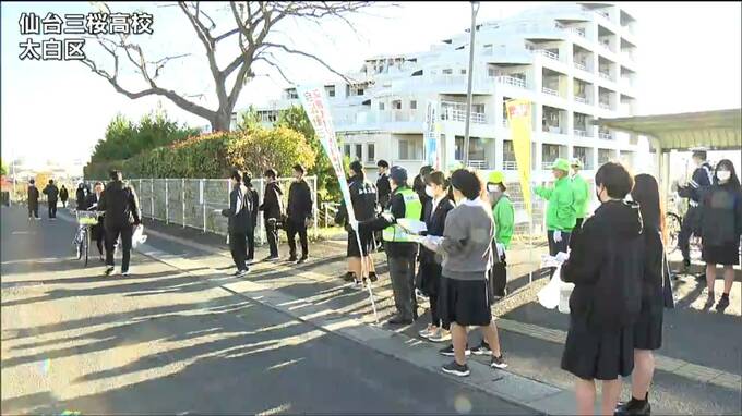 安全キャンペーンが行われたのは県内26の高校です。このうち仙台市太白区の仙台三桜高校では、生徒や警察官らおよそ30人が参加しました。これは、自転車を利用する機会が多い高校生に交通ルールの遵守やヘルメット着用の推進を図るために行われたもので、参加者は「ヘルメットをかぶろう」などと書かれたチラシを登校してくる生徒に配りました。