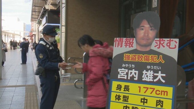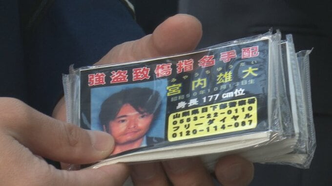県警は情報提供を求めるため15日朝、JR甲府駅前と山梨市駅前におよそ30人が出て、宮内容疑者の顔写真入りのポケットティッシュを配りました。