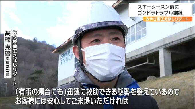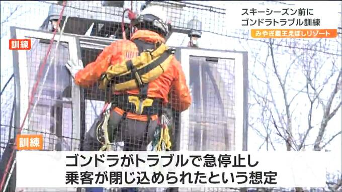 蔵王町のみやぎ蔵王えぼしリゾートで行なわれた訓練には、スキー場の関係者や仙南地域の消防署員らおよそ40人が参加しました。訓練は、標高およそ1100メートルの石子ゲレンデでゴンドラが急停止し、乗客が閉じ込められたという想定で行われました。参加者は、ゴンドラのワイヤーにロープをくくりつけてからゴンドラに移動しました。閉じ込められた乗客の体調を確認し、救助用の服にフックを装着したあと、ゆっくりと地上に降ろして救出しました。