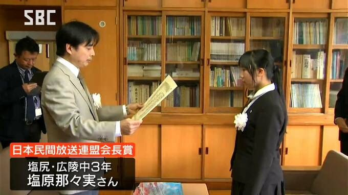 受賞したのは、塩尻市の広陵(こうりょう)中学校3年の塩原那々実(しおはら・ななみ)さんの作品で、表彰状などが贈られました。