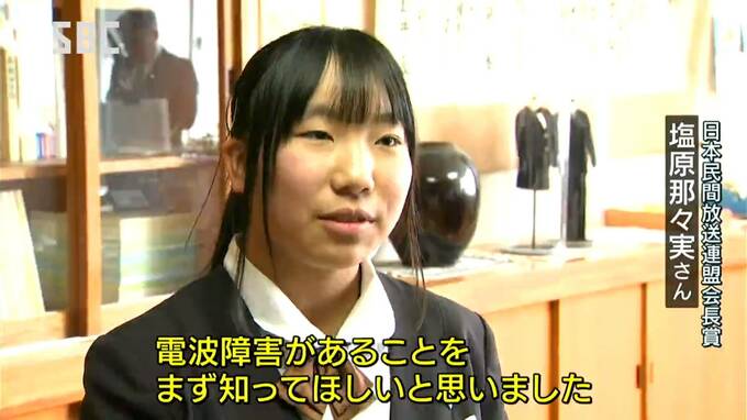 電波の受信障害の防止を呼びかける図案コンクールで、塩尻市の中学生が描いた作品が日本民間放送連盟会長賞を受賞しました。