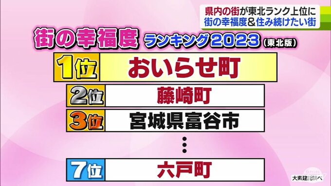 なかでも注目は「街の幸福度ランキングの東北版」。3位の宮城県富谷市に続いて2位に輝いたのは2022年の1位・藤崎町。幸福度の大きな要因となる収入や結婚、家族仲などの項目で満足している回答者が多かったという事です。そして1位も県内から!おいらせ町が初めて1位に輝きました。