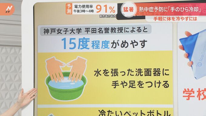 ではどうやって冷ますか、ただ冷やせばいいというわけではないそうです。神戸女子大学の平田名誉教授によりますと、15度程度の水に手をつけると良いということです。洗面器などに水を張り、手や足をつけるとちょうどいいということなんです。