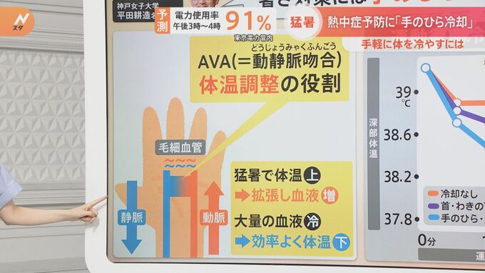猛暑で体温が上がると血管が拡張し、血液の量も増えます。血液がたくさん血管を通っていくわけなんですが、たくさん通っているときに、AVAを冷ませば、大量の血液を一気に冷やすことができるということで、効率よく体温を下げられるそうです。