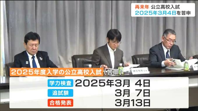 15日は、入学者選抜審議会の田端健人委員長が県教委の佐藤靖彦教育長に答申書を手渡しました。答申では、2025年度入学の公立高校入試について学力検査の実施を2025年3月4日、追試験を3月7日、合格発表を3月13日とするよう求めています。本試験と追試験の間が中2日と短いため、インフルエンザや新型コロナなどへの感染が疑われる受験生は、第二次募集が行われる3月19日に改めて受験機会を設ける方針です。