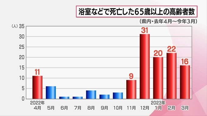 こちらは去年4月から今年3月までの浴室などでの死亡者数を月別で表したグラフ。