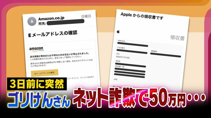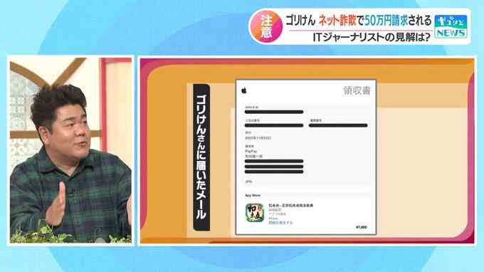 タレント・ゴリけんさんのスマホに矢継ぎ早に届いた60通を超えるメール。いずれも7000円分の“アプリ内課金”をしたとする「領収書」で、アップル社のロゴマークが入っていた。総額は約50万円。本人は「課金した覚えはない」と話す。領収書にあったのは、サイコロのイラストが付いた中国語のゲームアプリだった―。