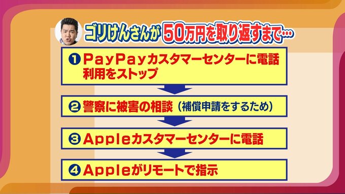 ゴリけんさん「Appleのカスタマーセンターの人が遠隔で調べてくれました。自分のものではない電話番号がAppleアカウントに登録されていたんです。色んなパスワードも変更しました」