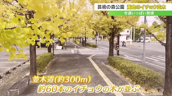 約300mある並木道には約60本のイチョウの木が並び、一帯は鮮やかな黄色に包まれています。