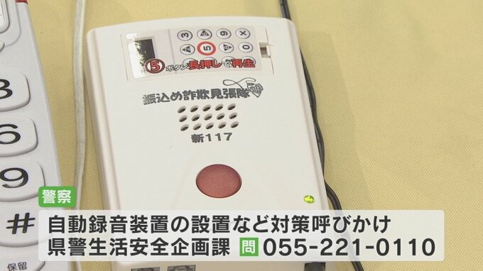 警察は着信前に相手の音声を自動で録音する内容がアナウンスされる「電話詐欺抑止装置」を無料で貸し出し、注意を呼びかけています。