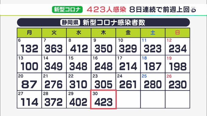 6月30日、静岡県内で新たに423人が新型コロナウイルスに感染したことがわかりました。新たな感染者を自治体別にみますと、浜松市で129人、静岡市で67人、富士市で29人などとなっています。先週の木曜日(6月23日:3…