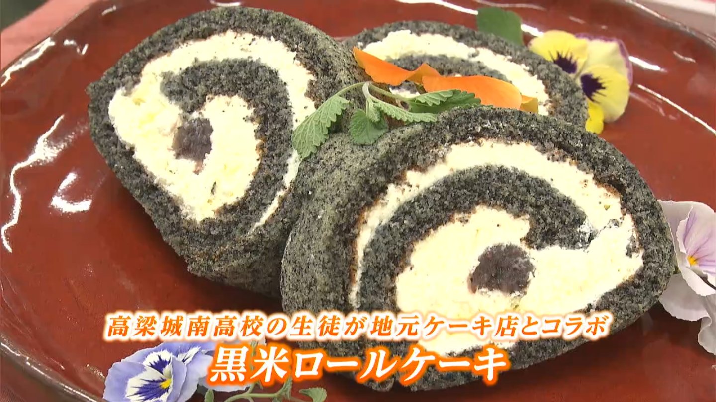 高梁産の黒米粉をふんだんに使ったロールケーキは、高梁城南高校の生徒が地元のケーキ店と考案したものです。