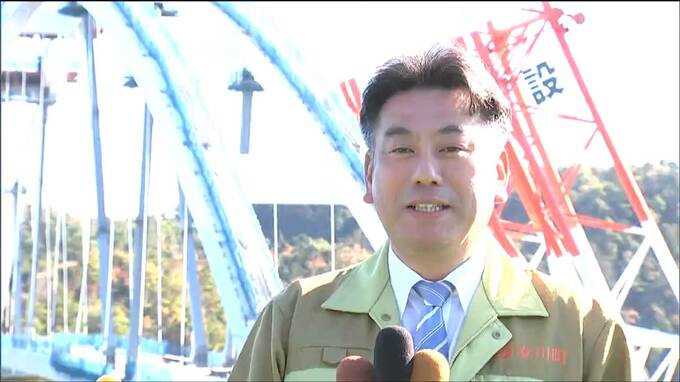 この「出島架橋(いずしま・かきょう)」は、離島の出島と本土を結ぶ全長364メートルのアーチ橋です。陸上で造った橋を3回に分けて運び、現地に架設する計画で、最後の中央アーチの設置により出島と本土が橋でつながりました。