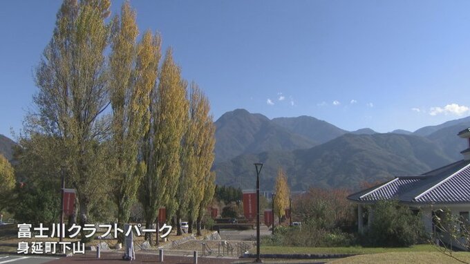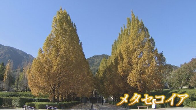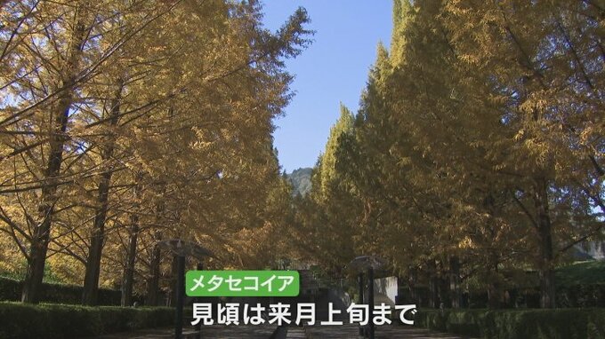 山梨県身延町の富士川クラフトパークでメタセコイアの並木が黄色く色づきました。