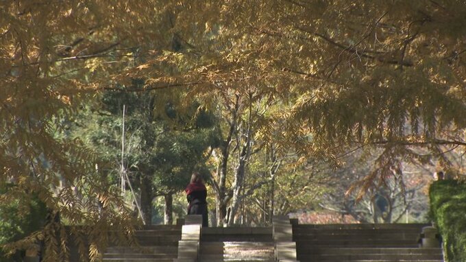 公園内の約50本の並木は黄色く色づき、葉が落ちる前の鮮やかな紅葉が訪れる人たちを楽しませています。