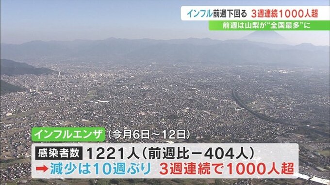 県によりますと、11月12日までの1週間に県内41の定点医療機関から報告があった感染者数は、前の週より404人減った1221人でした。