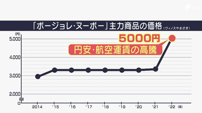 ヴィノスやまざきによるとボージョレ・ヌーボーの主力銘柄は以前、3000円台前半でしたが、2022年は円安やウクライナ侵攻の影響で5000円まで跳ね上がりました。強まる円安の中で迎えた2023年は…。