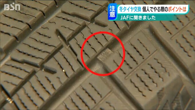 スタッドレスタイヤの“溝の深さ”の半分程度を示すこのプラットホームが露出した冬用タイヤは、もう既に溝の深さが半分以下にまで減っていることになります。