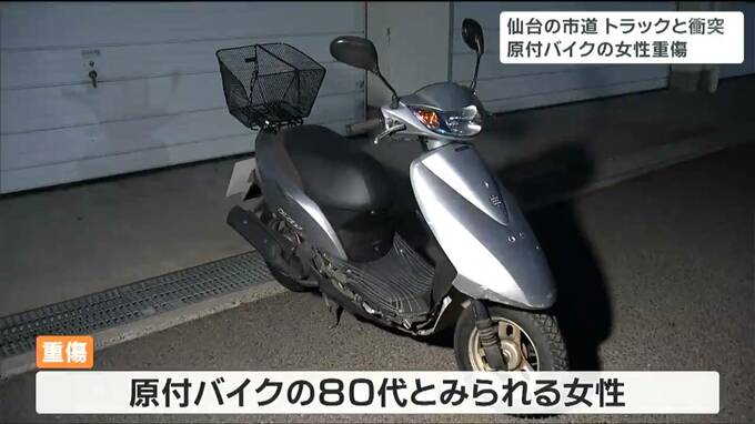16日昼前、仙台市内の市道で走行中のトラックと原付バイクが衝突しました。原付バイクに乗っていた高齢の女性は重傷で病院に運ばれました。16日午前11時40分頃、仙台市太白区八木山本町1丁目の市道で、地下鉄八木…